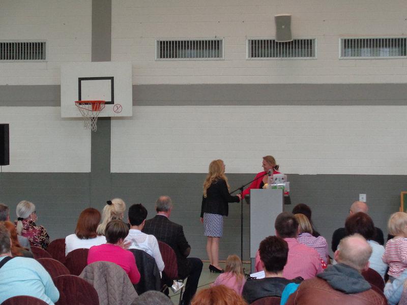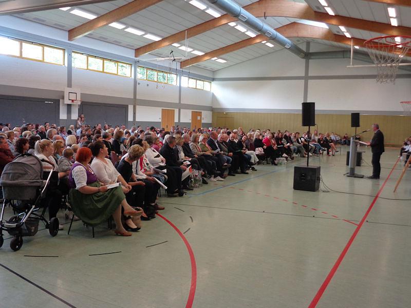 Beate Bandur wählte für ihre Rede das Gedicht von Julia Engelmann „Für meine Eltern“, dass die Eltern-Kind-Bindung zum Inhalt hat. „Und ebenso sollten Kitas mit den Eltern eine Erziehungs- und Bildungspartnerschaft eingehen.“ Den Namen „Kinderlachen“ wählte man gemeinsam aus, „denn Kinderlachen ist die schönste Melodie“. Julia Schäfer und Franziska Herber vom Elternbeirat sprachen allen Beteiligten am Neubau und am teilweisen Umzug ihren Dank aus. Umrahmt wurde die Einweihungsfeier, die wegen der großen Resonanz in der Limeshalle stattfand, von Lied- und Tanzbeiträgen der Kinder und Erzieherinnen. Obwohl die Kita seit Anfang Mai in Betrieb ist, fand vor dem Eingang des Gebäudes der symbolische Banddurchschnitt statt. Zuvor hatte der evangelische Pfarrer Oliver Mohn eine Segnung ausgesprochen. Abschließend überreichte Ludwig den Kindern einen großen Schlüssel aus Holz, und gab damit den Kindergarten ganz offiziell frei.