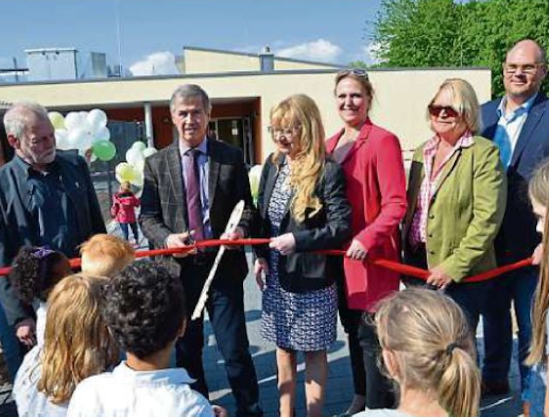 Ein Atrium bringt Licht in die Flure. Das Außengelände hat eine Fläche von rund 5000 Quadratmetern, wird derzeit noch nach den Themenbereichen Gärtnern, Bauen und Bewegung gestaltet, und soll im Juni fertig sein, kündigte Ludwig an. Die Bauzeit dauerte ein Jahr, die Kosten lagen im Rahmen des Budgets, wie Ludwig zufrieden mitteilte. Wie auch die nachfolgenden Redner dankte er den politischen Gremien, die hinter der Investition gestanden hätten, sowie allen am Bau beteiligten Fachstellen für die gute Zusammenarbeit.