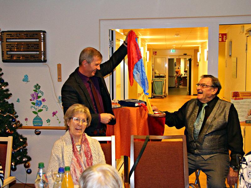 Bei Kaffee, Stollen, Kuchen und weiteren Getränken sorgte der bekannte, ehemalige Moderator von „Hessen lacht zur Fassenacht“ Karl Oertel mit seinem Humor für eine ausgelassene Stimmung. Zur Belustigung erzählte er kleine Geschichten von Adam und die Mickys, von Heinz Erhard und aus seiner eigenen Lehrzeit.