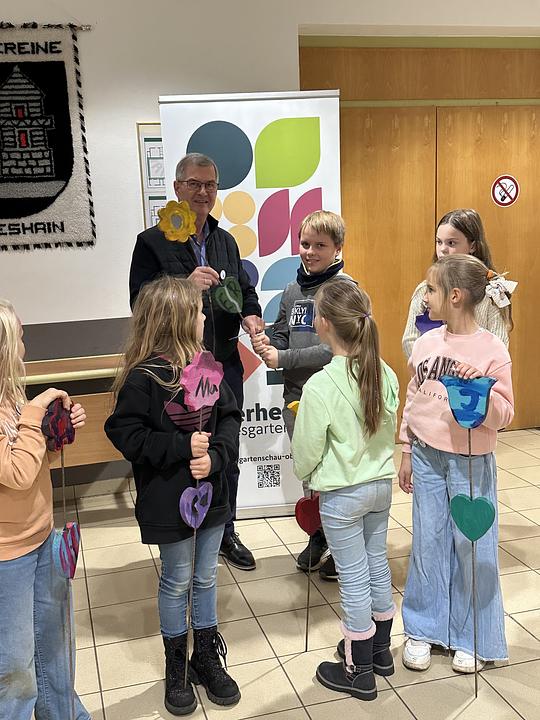 Unter Anleitung von Jugendpflegerin Victoria Galic und Margit Bopp, sie ist Mitglied im Vorstand des Freundeskreis Landesgartenschau Oberhessen, fand die Malaktion in den Herbstferien im Rahmen der Ferienspiele statt. Jetzt nutzten die Kinder gemeinsam mit Galic und Bopp die Limeshainer Bürgerversammlung, um ihre Exemplare im Vorfeld zu präsentieren und eine Blume an Bürgermeister Adolf Ludwig zu überreichen. Der freute sich und lobte die Arbeit der Jungen und Mädchen, die mit viel Sorgfalt und Phantasie an die Arbeit gingen. Ludwig versprach, Plätze in Hainchen, Himbach und Rommelhausen auszusuchen, um die Blumen im öffentlichen Raum für jeden sichtbar zu präsentieren. Gesponsert wurden die Blumen, die in der Teilhabe Wetterau in den Hirzenhainer Werkstätten hergestellt wurden, in diesem Jahr vom Freundeskreis Landesgartenschau. Die Malaktionen wurde mittlerweile auch in den anderen Kommunen während der vergangenen Monate in verschiedenen Kinder- und Jugendgruppen durchgeführt, erklärte Bopp, die die Malaktion in den teilnehmenden Kommunen auch jeweils mit organsierte. Fachliche Unterstützung hatten die interessierten Kommunen durch Dieter Leibold aus Glauburg, der die Idee mit den Blumen hatte, und die beim Vorsitzenden des Freundeskreises, Jürgen Stelter, auf offene Ohren stieß. Hintergrund der Aktion war, auch Kinder und Jugendliche in Kommunen und Städten für die LGS zu interessieren. 30 Blumen bemalten die Kinder in Limeshain, davon werden 20 Blumen aufgestellt. Als Belohnung für ihre Arbeit durfte sich jedes Kind eine Blume mit nach Hause nehmen.