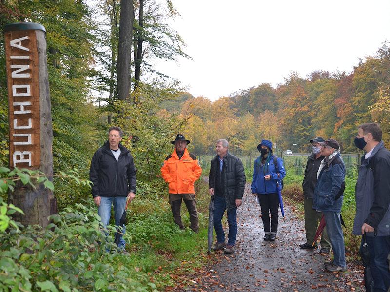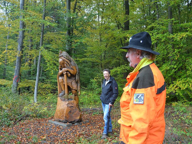 Pfuhl erklärte auch die eine oder andere Infotafel. Besucher des Rundweges können auch mit Hilfe eines Audioführeres und mittels eines QR-Codes an den Tafeln die Reise in die Vergangenheit machen. Viele Informationen seien kindgerecht verfasst und teilweise als Gespräch zwischen Erwachsenem und Kind wiedergegeben. Und es gibt ein GPS-gestütztes Geocaching-System, denn auch eine Schatzkiste ist im Wald verborgen. Venezianischrot gestrichene Pfosten mit Wegweisern zeigen die Richtung. Verlaufen kann man sich also nicht im Wald.