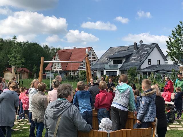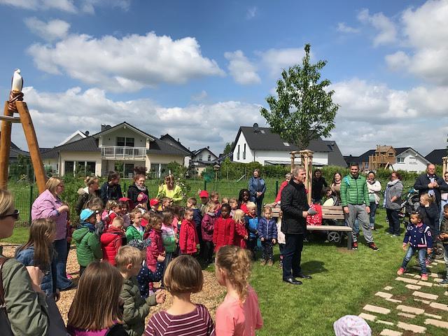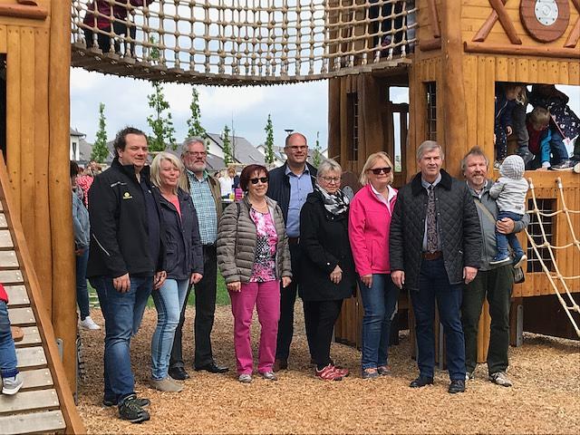 Bürgermeister Adolf Ludwig dankte den Gemeindegremien für die Zustimmung zum Bau des 300 000 Euro teuren Themenspielplatzes. Er lobte die gelungene Ausführung, konzipiert vom Landschaftsarchitekturbüro Weiß & Becker und dem Garten- und Landschaftsbaubetrieb Dillmann. Die Entwurfsplanung für den Spielplatz wurde im Dezember 2017 vorgelegt, im Oktober 2018 wurde mit dem Bau begonnen. Dann galt es, die endgültige Fertigstellung mit dem Straßenendausbau der Bauabschnitte zwei und drei im Försterahl in Einklang zu bringen. Inzwischen ist auch das gesäte Gras fest verwurzelt, sodass der Spielplatz endlich freigegeben werden konnte.