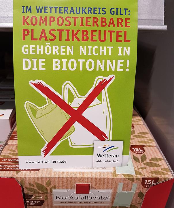 „Im Wetteraukreis gilt: Kompostierbare Plastikbeutel gehören nicht in die Biotonne!“ Mit diesem Slogan und einem Bild klärt der Abfallwirtschaftsbetrieb des Wetteraukreises die Bürgerinnen und Bürger auf, dass diese Beutel nicht in die Biotonne gehören.